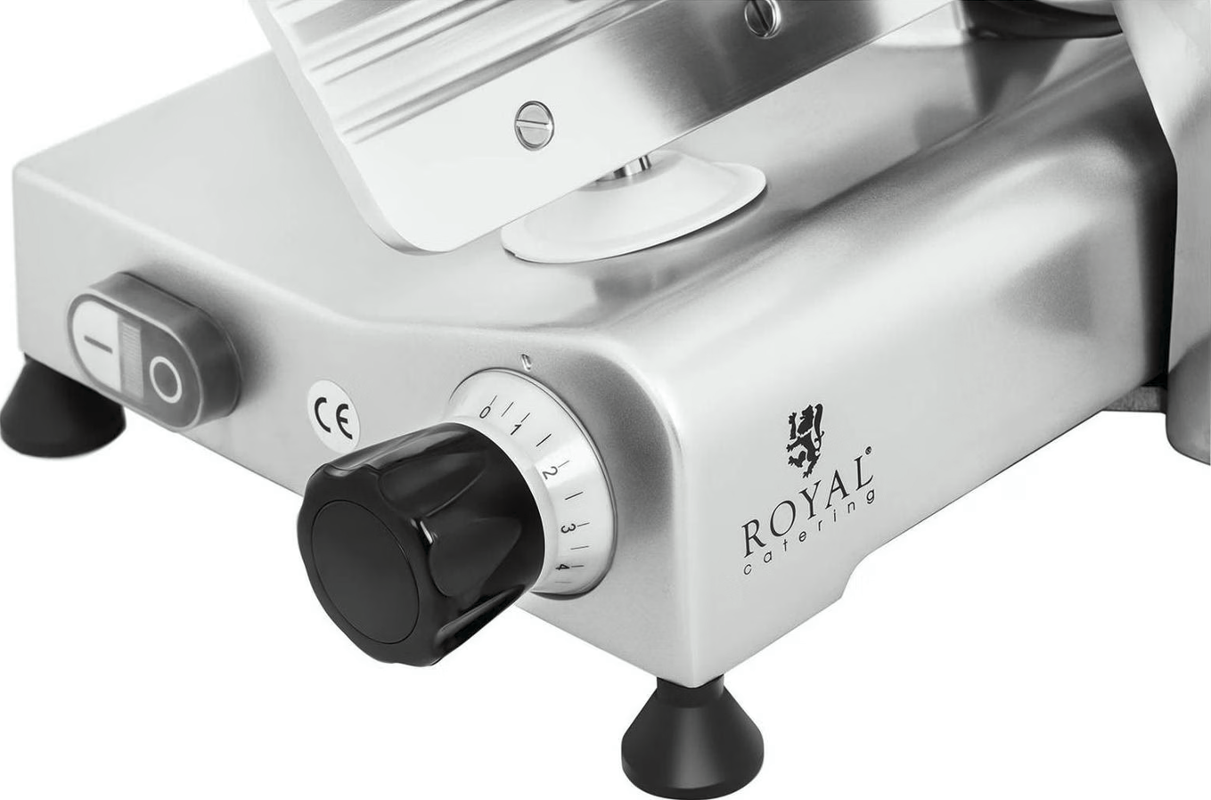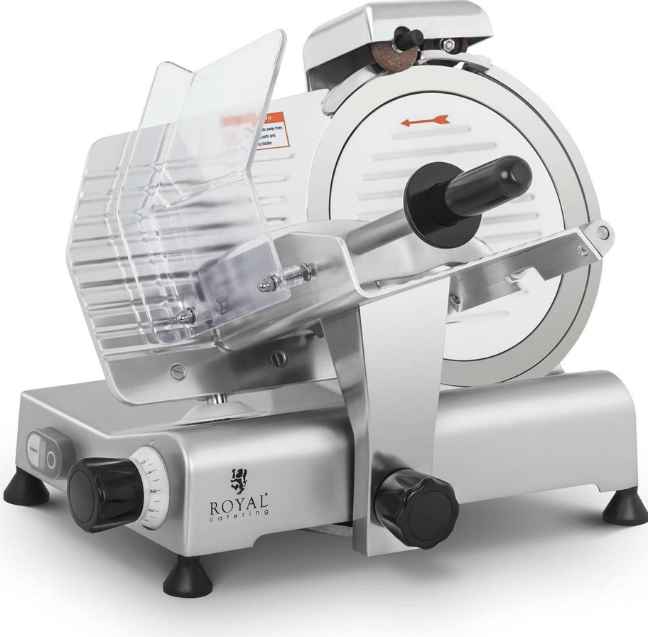 Die Royal Catering Aufschnittmaschine Ø 250 mm überzeugt durch präzise Schnittergebnisse, robuste Edelstahlqualität und einfache Handhabung.
